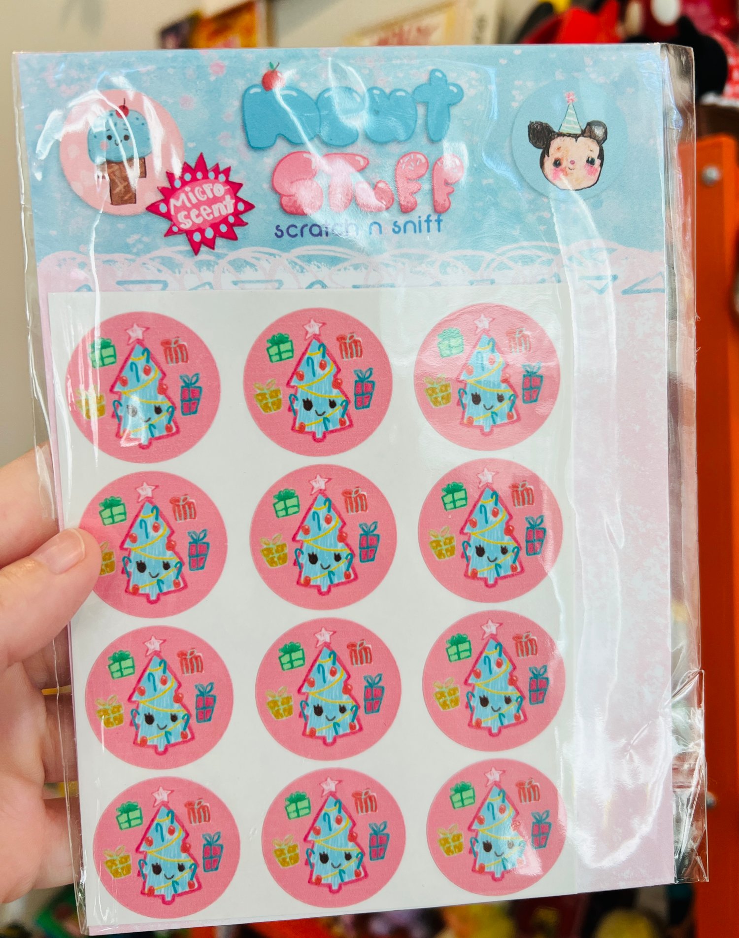 You get 24 1.25" stickers is this pack and they are Christmas Tree micro-encapsulated scent when scratched.